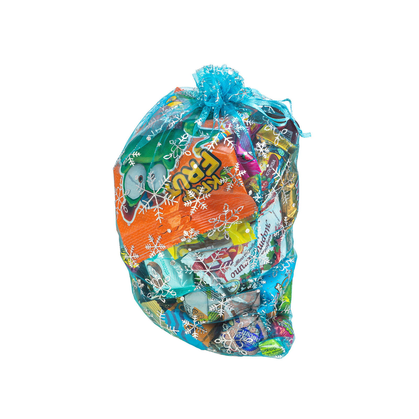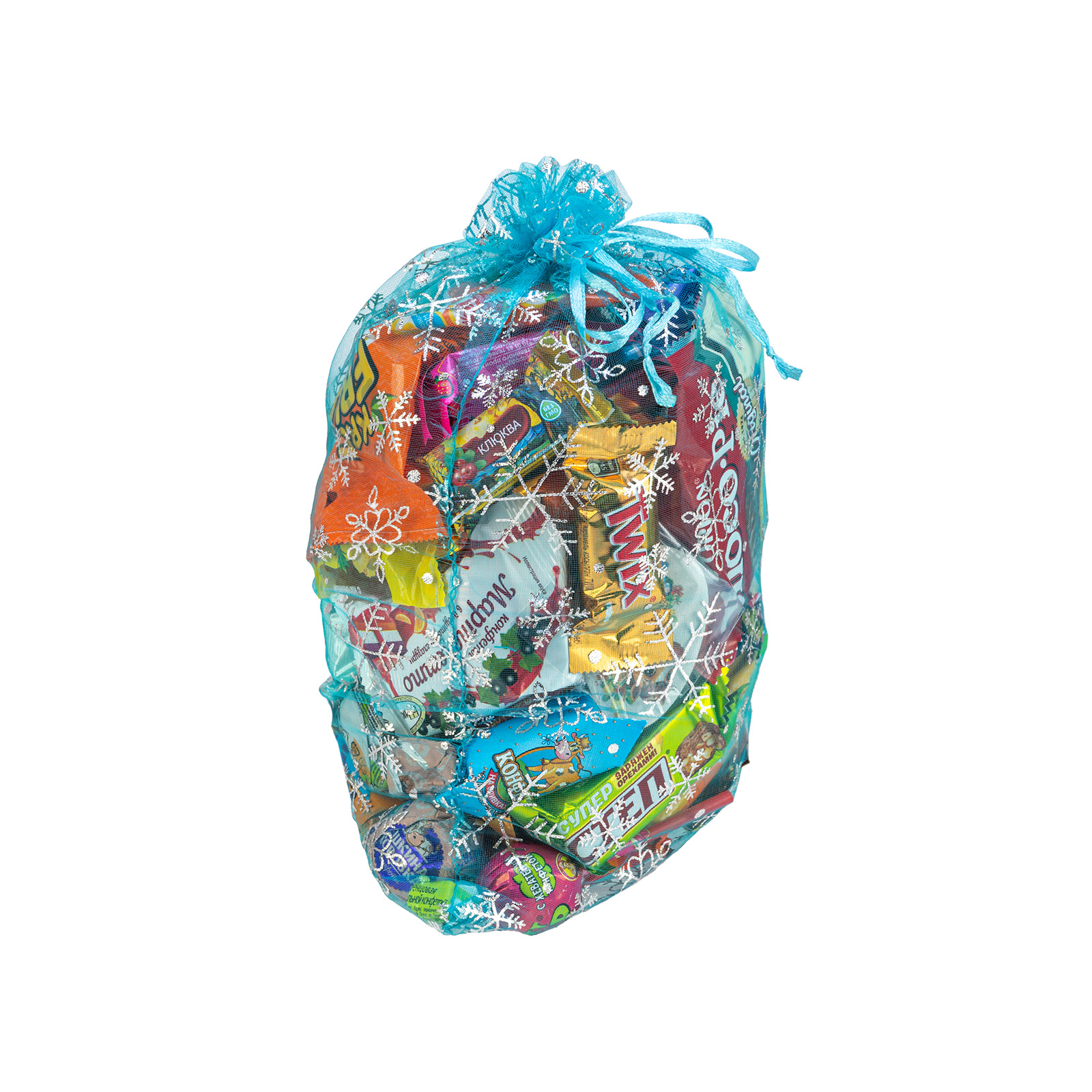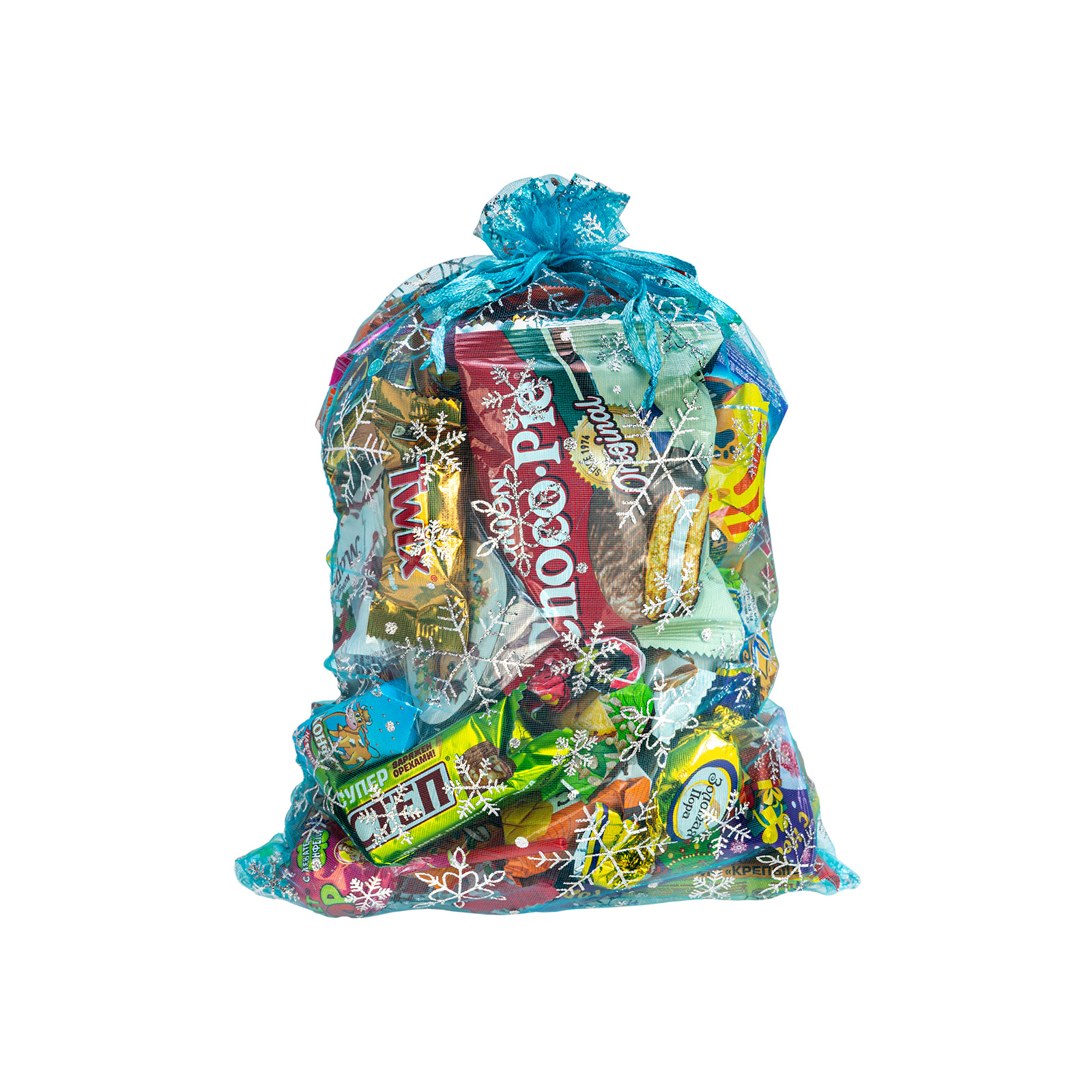 Новогодний сладкий подарок должен быть не только вкусным, но и практичным. Подарок “Мешочек снежинки” как раз полностью соответствует этим требованиям. Это килограмм вкусных и разнообразных кондитерских изделий, бережно упакованных в текстильный мешочек небесно-голубого цвета. Упаковка выполнена из качественного материала, со всех сторон на нее нанесены узоры в виде фигурных завораживающих снежинок, сверху мешочек плотно перевязан веревочкой. Данный подарочный набор прекрасно подойдет для сластены любого возраста: его можно вручить как на детском празднике, так и на корпоративе в крупной компании.