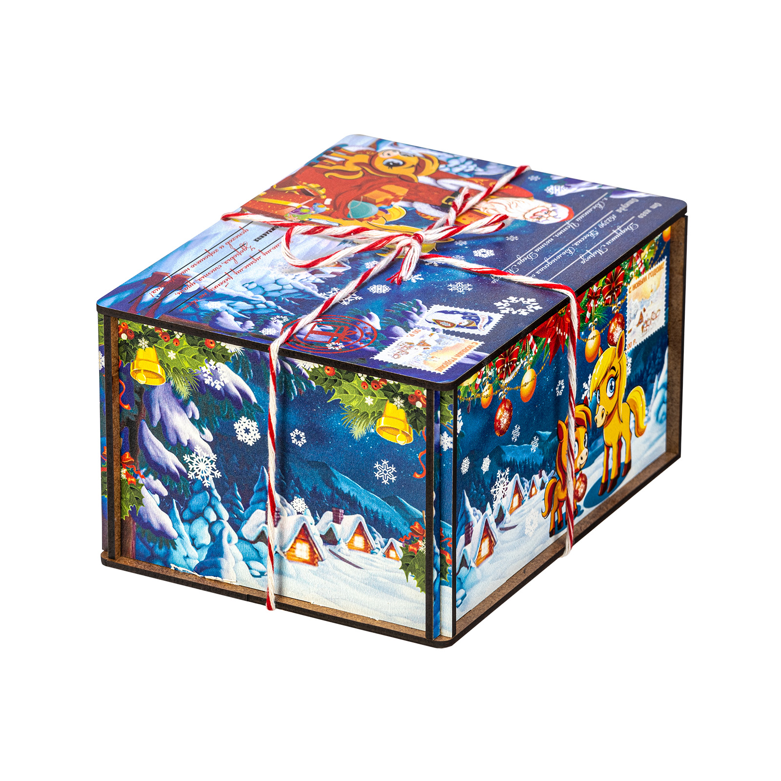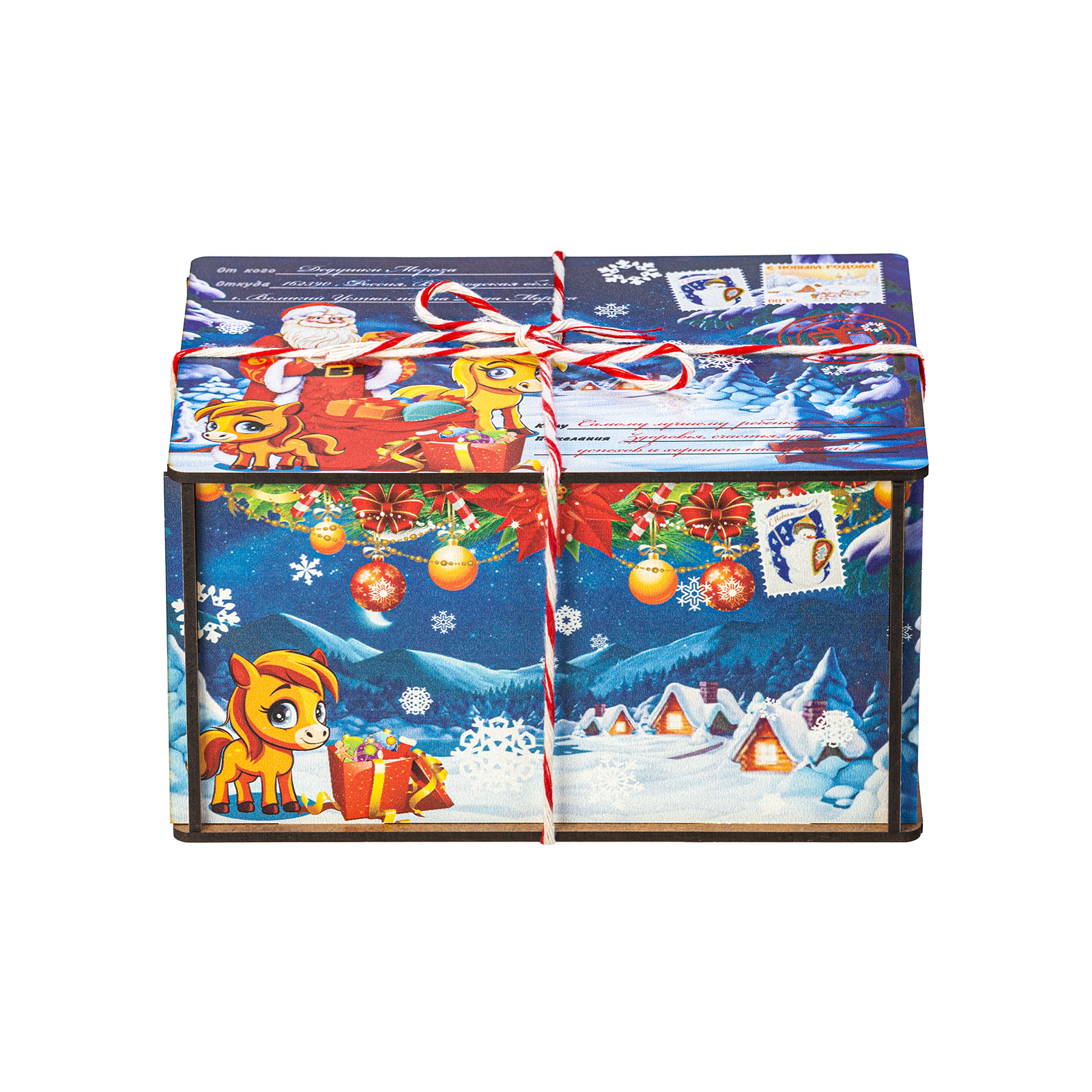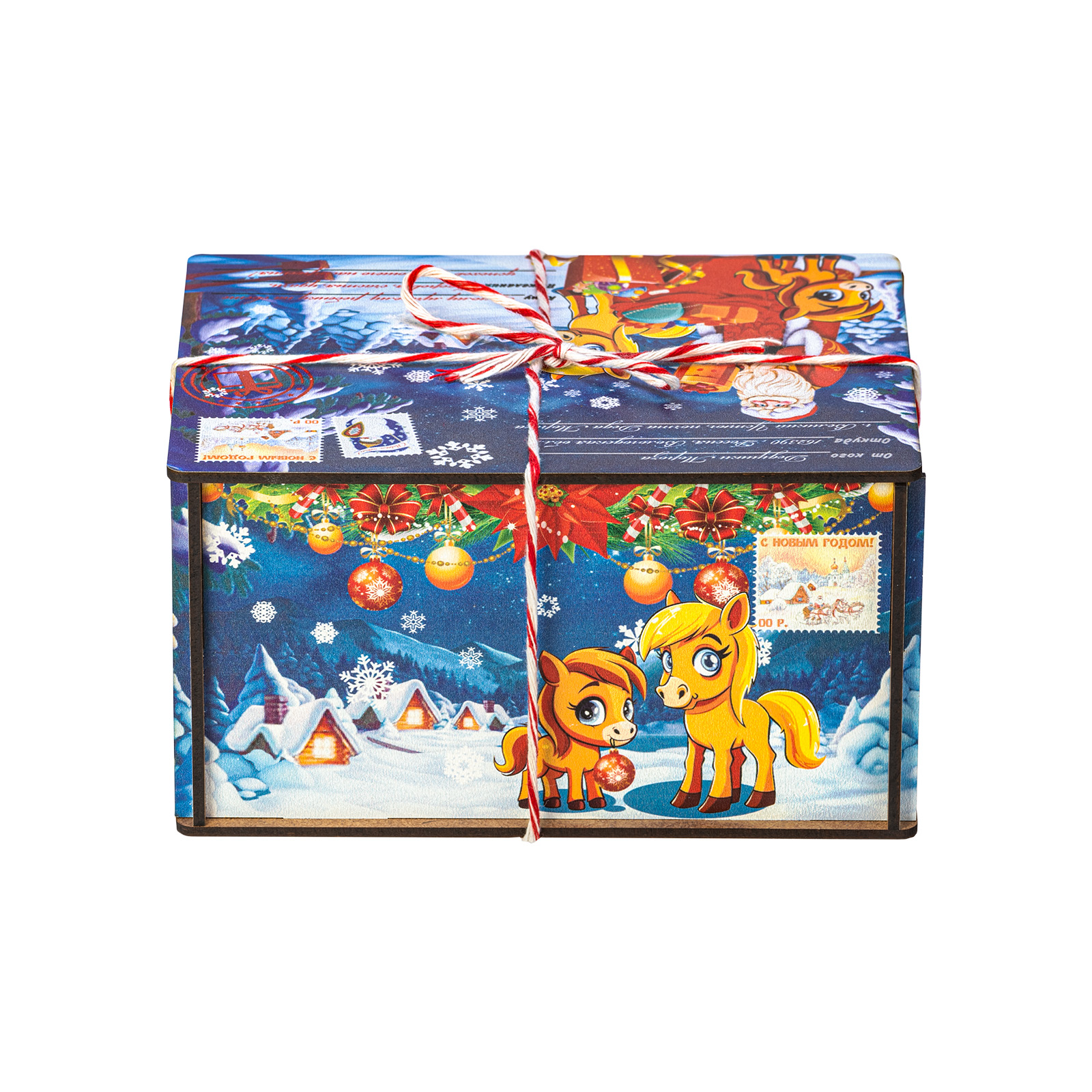 Помните, как вы радовались, получая посылку с гостинцами от дальних родственников? Именно такие искренние яркие эмоции способен вызвать подарок “Посылка от сказочной лошадки”! Это небольшой подарочный набор, помещенный в деревянную коробочку, со всех сторон украшенную пестрыми иллюстрациями с узнаваемыми праздничными символами: Дед Мороз с подарками, еловая ветка с цветными шарами, маленькая очаровательная лошадка. Сверху подарок перетянут красно-белой веревочкой шнурком, который так и хочется поскорее развязать, чтобы посмотреть на содержимое этой посылки! Внутри бережно хранятся вкусные разнообразные лакомства и небольшой памятный сувенир в виде символа наступающего года. Такой подарок прекрасно подойдет к любому новогоднему торжеству или походу в гости!